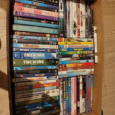 Samling med diverse DVD filmer i ulike sjangre. Bildene viser blant annet action-, thriller-, komedie- og dokumentarfilmer, samt enkelte TV-serier og barnefilm. Noen titler ligger i original DVD-cover, mens andre ligger i et separat DVD-etui. Egner seg for den som ønsker en variert samling DVD-filmer til hjemmekino eller DVD-spiller. Antall titler og eventuelle undertekster eller språk fremgår delvis av omslagene på bildene. Ca 70 filmer med cover og 40 i dvd-etui.