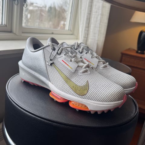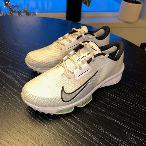 FootJoy Pro SL golfsko i størrelse 42. Modellen er en spikeless golfsko med overdel i syntetisk materiale i hvit farge med brune detaljer. Yttersålen har mønster med gummiknotter for godt grep på banen. Skoene har snøring foran og polstret hælparti for stabilitet og komfort under gange og sving på golfbanen.