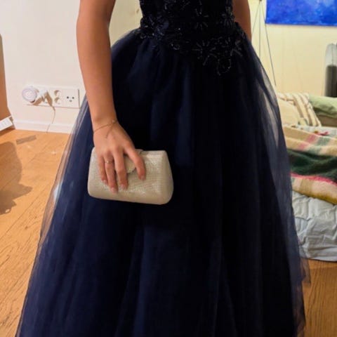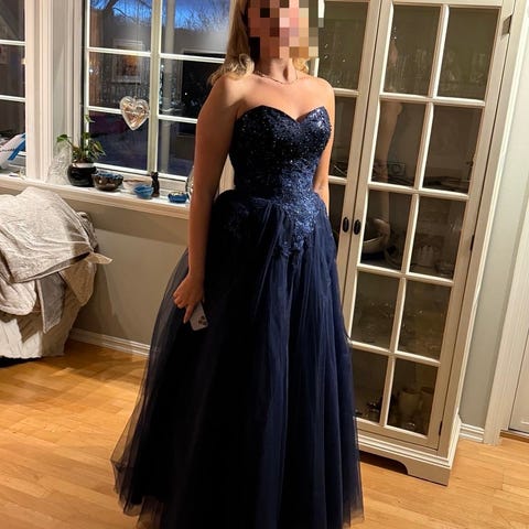Alexandra Ritzi festkjole i størrelse XS for dame. Kjolen er i en nydelig blåfarge med snøring bak og laget i tyll. Overdelen har tettsittende fasong, mens skjørtet er langt og voluminøst i flere lag med tyll. Passer perfekt til min datter som er ca 163 cm høy, men kan godt bruke heler til. Kun brukt et par ganger. Selges som er for kr. 3 500.