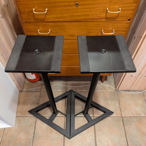 Høyttalerstativer med justerbar høyde i svart utførelse. Stativer med firkantede plater på toppen for plassering av høyttalere eller monitorer. Egnet for bruk i hjemmestudio, stue eller andre rom der man ønsker å plassere høyttalere på stativ for bedre plassering og lydspredning. Leveres som et par stativer slik som på bildet.