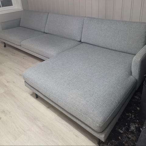 Sofaen er i god stand og fungerer fint som vanlig sofa. Den har også oppbevaringsplass.