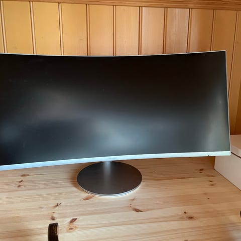 Skjerm med buet 34-tommers bredformatskjerm. Modellen har DisplayPort- og HDMI-innganger, samt innebygde USB-porter. Oppløsning: 3440 x 1440