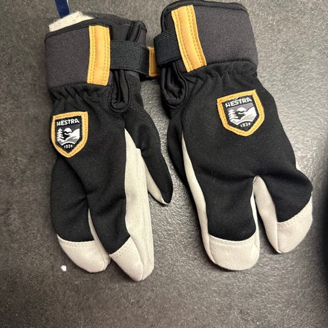 Hestra barnevotter i størrelse 3. Vottene er tofargede i svart og beige, med mykt fór på innsiden. De har justerbar stropp rundt håndleddet for bedre passform og snorstramming øverst for å holde snø ute. Vottene har også avtagbare håndleddsstropper med Hestra-logo for å redusere risiko for å miste dem. Egnet som varme ute- og vintervotter til barn.