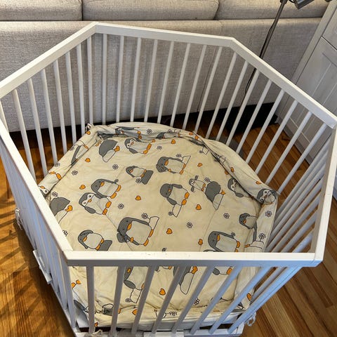 Jollyroom lekegrind i hvit farge. Lekegrinden har klassisk utforming med rette sprosser på alle sider. Den gir et avgrenset og trygt område for små barn til lek og hvile. Bunnen har madrass med vanntett trekk, egnet for innendørs bruk. Passer til bruk i stue eller barnerom som leke- og hvileplass for baby og småbarn.