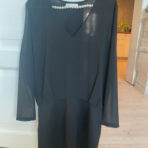 Philosophy blues originale festkjole for dame i størrelse M. Kjolen er svart og laget i polyester og bomull . Modellen har lange ermer og høy hals. Stoffet virker lett og glatt, med innfelte sømmer og paneler som gir et enkelt, rent uttrykk. Passer som festkjole eller til andre anledninger der man ønsker en mørk, enkel kjole.