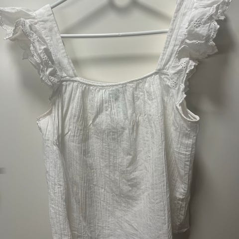 Mango topp for dame i størrelse L. Toppen er hvit og laget i bomull. Den har rund hals, knapper foran og rysjedetaljer langs skuldre og sider. Stoffet har struktur med små legg foran og bak. Passer som sommertopp eller til hverdagsbruk sammen med bukser, skjørt eller shorts.