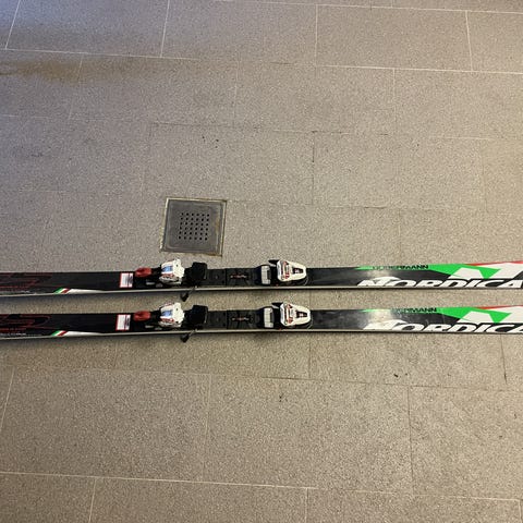 K2 Konic 75 alpinski på 156 cm med integrerte bindinger. Skiene har midtbredde på ca. 75 mm og er egnet til bruk i preparerte løyper.