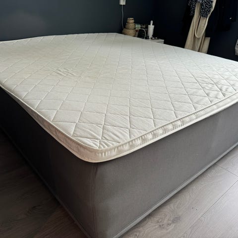 Seng med overmadrass. Ukjent merke. Sengen består av en todelt bunn og en hel overmadrass på toppen. Overmadrassen har quiltet trekk, og hovedmadrassen har mønster i stoffet. Passer til bruk på soverom, gjesterom eller hytte. Farge på tekstil er lys, nøytral tone.