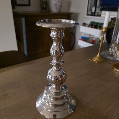 Eldre lysestake høyde ca 9cm, diameter ca 11cm, silver platen made in England.