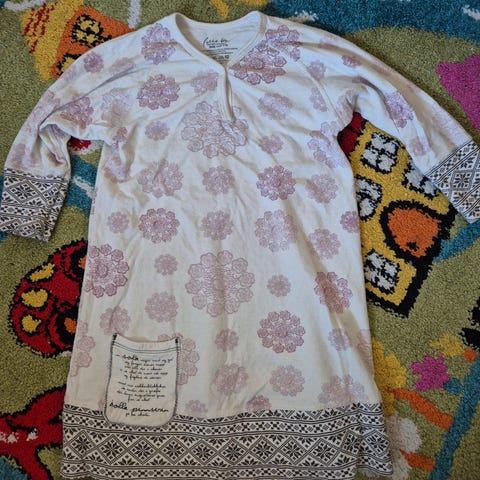 Deilig nattkjole med lange ermer i bambusviskose. Pent brukt, liten rosa flekk på lommen, ikke forsøkt flekkfjerning.