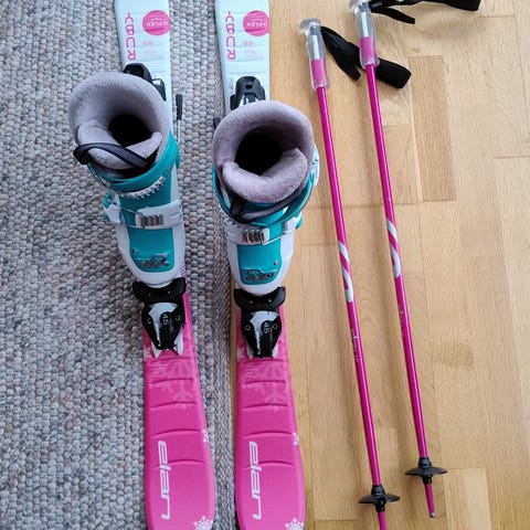 Elan alpinski 110 cm i rosa og hvit og Roxa alpinstøvler str MP 180-215 justerbare for barn i svart og hvit farge. Støvlene har justerbare spenner i metall og plast for tilpasning rundt fot og legg. Myk innersko gir grunnleggende komfort og varme. Yttersåle i plast er tilpasset bruk med vanlige alpinbindinger. Egnet til bruk i alpinbakke for barn som trenger stabile og enkle alpinstøvler.