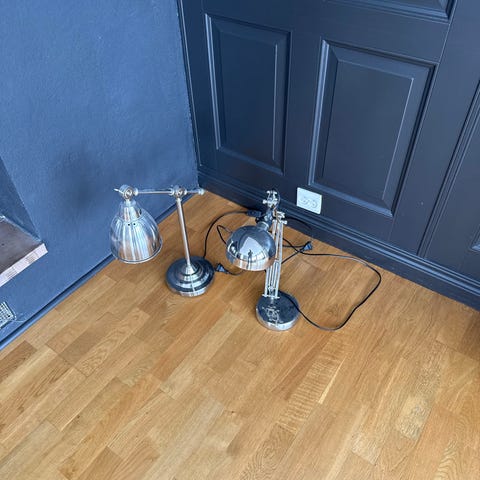 Selger tre stilrene kromlamper: to bordlamper og én gulvlampe. Uten kapper, så bestem endelig stil selv