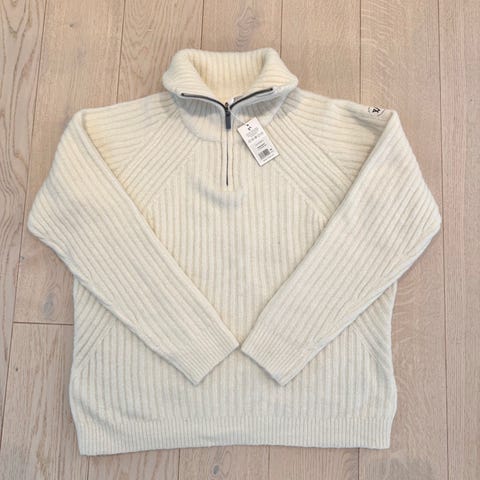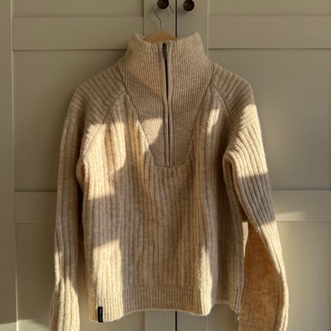 Twentyfour genser for dame i størrelse L. Genseren er beige og strikket i ull med ribbestruktur. Den har høy hals med glidelås og krage som kan brettes ned, samt lange ermer. Passer til hverdagsbruk og som mellomlag på kjølige dager.