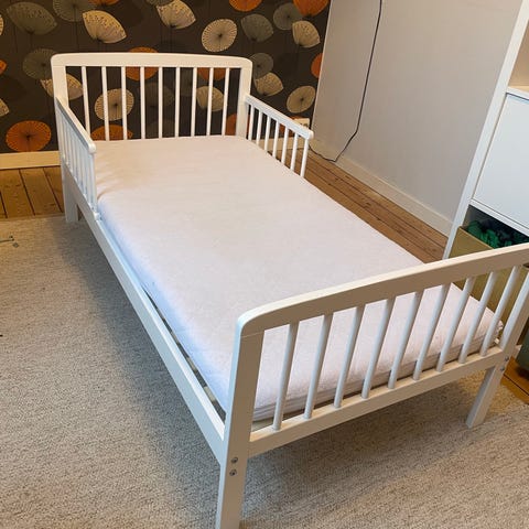 Hvit juniorseng fra Jollyroom. Madrassmål 140 x 70 cm. Uttrekkbar skuff med to rom. Pent brukt, noen små bruksmerker. Kjøpt ny av oss i 2022.