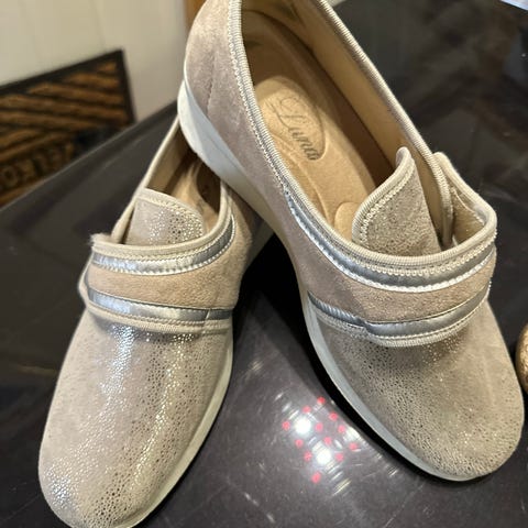 Nydelige semskede sko i mosegrønn farge. Brukt en gang. Fine dusker og god såle. Str.39