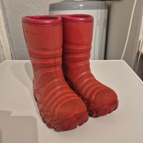 Viking gummistøvler, størrelse 22. Støvlene er i rosa farge. Grovmønstret såle gir godt grep på vått og glatt underlag. Overdel i vannavvisende materiale og fôr på innsiden for økt komfort. Egnet til bruk i regn og vått vær i barnehage, skole eller fritid.