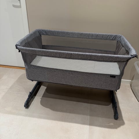 Kinderkraft høy barnestol i grå plast med ben i tre. Stolen har integrert matbrett, fotstøtte og sikkerhetssele. Egnet som spise- og sitteplass for små barn ved bordet. Designet for innendørs bruk i hjemmemiljø, for eksempel på kjøkken eller spisestue.