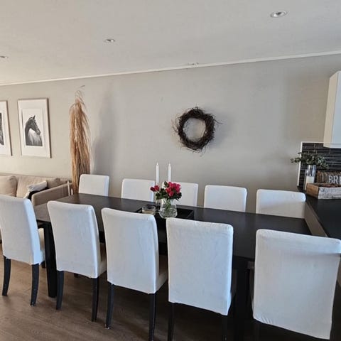 Spisebordet er 2 meter langt og 90 cm bredt, med 74 cm høyde fra gulv. Hvitbeiset eikefarge med 8 svarte spisestoler med trestruktur. Har for det meste stått på møterom på kontor og brukt her hjemme en kort periode som spisebord.