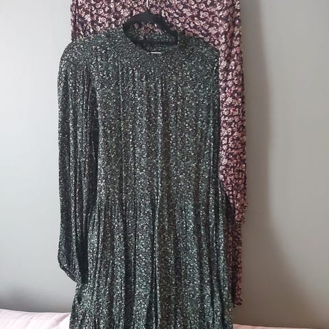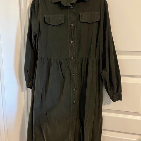 KAFFE hverdagskjole for dame i størrelse 44. Kjolen er laget av bomull og kommer i grønn farge. Modellen har knepping foran, krage og lange ermer som kan brettes opp. Skjørtet har volangfelt som gir en løs og komfortabel passform. Egner seg godt som hverdagskjole.