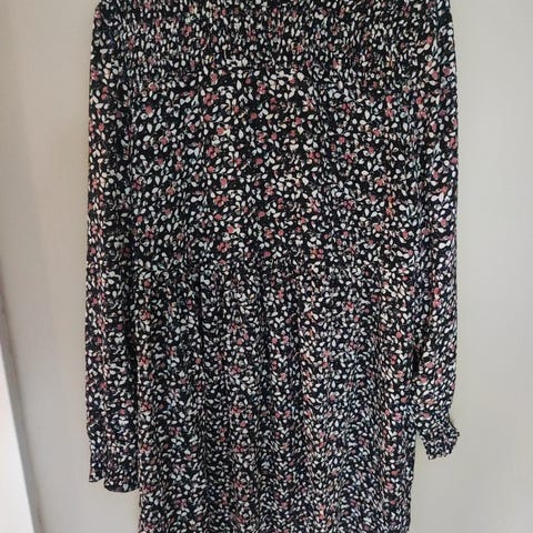 Kaffe hverdagskjole for dame i størrelse 42 og 44. Vil si de er løs i passform og at begge tilsvarer 44.Kjolene er flerfarget med blomstermønster og har lange ermer. Materialet er viskose, som gir et mykt og lett fall. Passer som hverdagskjole eller til enkle anledninger.