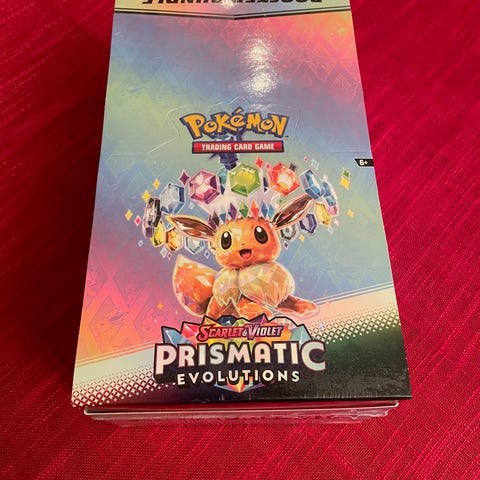 Boksen inneholder boosterpakker til Pokémon Trading Card Game fra utvidelsen Prismatic Evolutions. Produktet er beregnet for samlekortspill og kan brukes både til spilling og til å utvide en eksisterende samling av Pokémon-kort. Egner seg for spillere og samlere som ønsker flere kort fra denne serien.