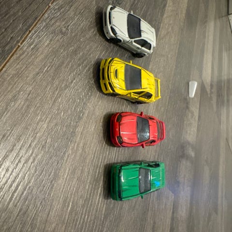 Ferrari lekebiler i rød farge, sett med flere biler i liten skala. Bilene er laget i hard plast og metall, med detaljerte karosserier og svarte vinduer. Egner seg som lekebiler eller som samleobjekter for modellbilinteresserte. Kom med bud