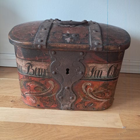 Rosemalt skrin, trolig fra Hemsedal datert 1855. L:46,5cm b:26,5cm h:26cm