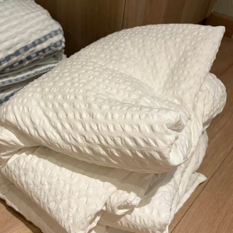 Stort ensfarget kremfarget sengeteppe med lekkert mønster.
