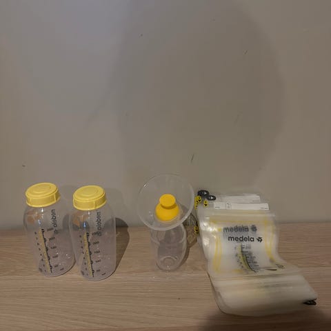 Pakke med flere tåteflasker i klar plast med gule og hvite lokk. Flaskene har måleskala på siden. Tilbehøret inkluderer flere skrulokk, smokker og traktformede plastdeler som kan brukes sammen med flaskene. Egnet til oppbevaring og mating av morsmelk eller morsmelkerstatning til baby.