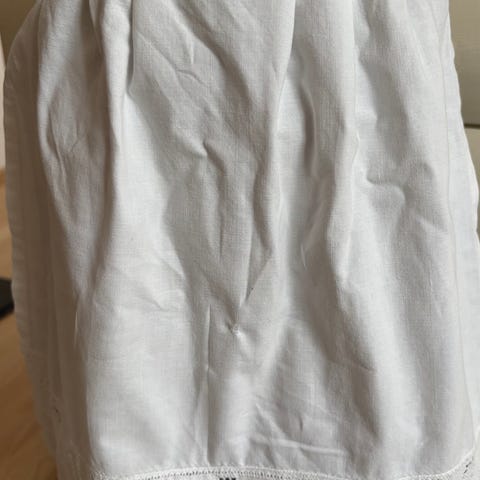 Forkle til jenter til 3-4 år Forkleet er hvitt og laget av bomull. Det har knytebånd i livet og dekorative broderte detaljer. Lende 36 cm bredde 34 cm 116 cm. Pris er per stikk 199 kr.