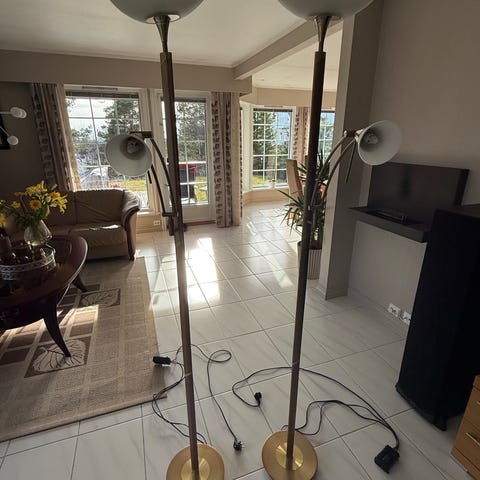 Dette er en moderne gulvlampe med tre armer, justerbare, fleksible halser, koniske hvite skjermer og en forkrommet metallbase.