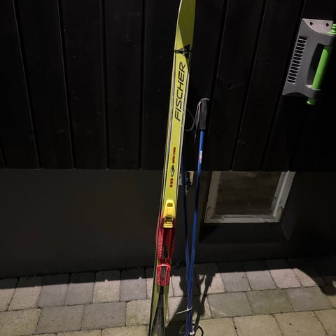 Fischer RCS langrennski med tilhørende staver. Skiene er klassiske langrennski smørefrie, med Rottefella bindingssystem montert.
