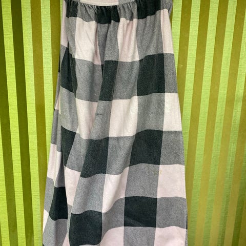 Topp og skjørt som hører sammen. Toppen er enkel med kort arm. Skjørtet er i to lag hvor det ytterste laget skrår ned på ene siden. Se bildet. Står str 2, noe som jeg tror må være ca Large etter hva størrelsen er vurdert av meg. (Arvet antrekk) Fargene her er gønn toner mot gul grønn farge på toppen. Kan sende.