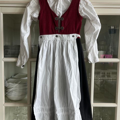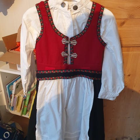 Vesten kan nok syes ut også i lengde (se bilder) , vesten sitter fastsydd til stakken, søm gått opp i rygg (se bilde), men lar seg lett reparere. Ellers er bunaden i god stand. Skjorte har str 120/122
