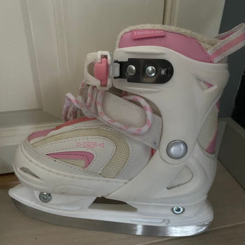 Skøytene er hvite med rosa og turkise detaljer og har justerbart spenn, lisser og plastskall som gir støtte rundt ankelen. Beregnet for bruk på is, for eksempel til ishockey eller generell skøytebruk. Blad i stål, men ene skøyten har en sprekk og selges derfor billig. Passer til barn som trenger skøyter i størrelse 36-41.
