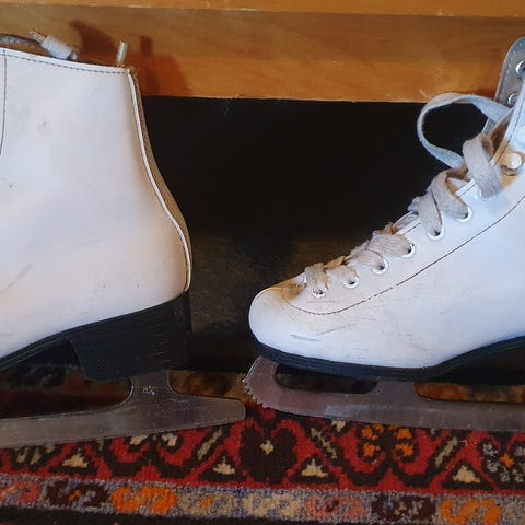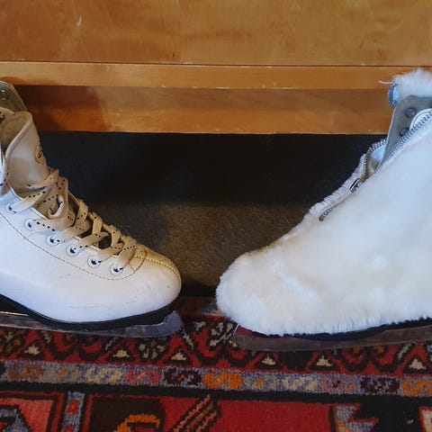 Kosa kunstløpskøyter med varmetrekk. Ser bra ut, men trengs å slipes pga litt rust under skøytebladet. Glidelås på det ene trekket trenger en ny holder. Mål på indre såle 22,5 cm