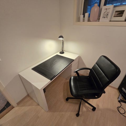 Micke skrivebord, kontorstol med hjul, arbeidslampe, skriveunderlag og gulvbeskytter selges, alt fra IKEA.