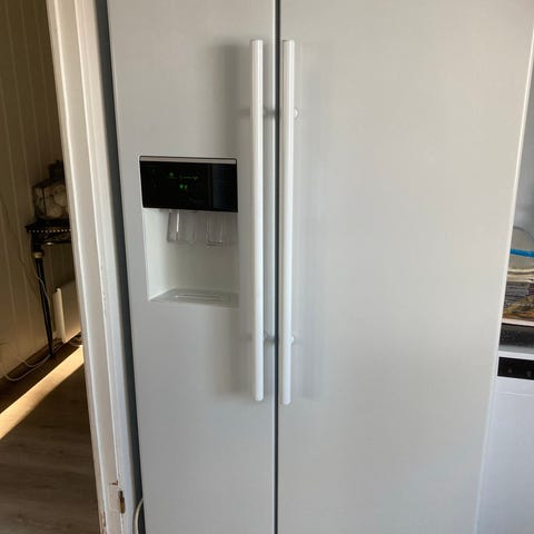 Frittstående hvitt kjøleskap. Modellen har enkelt innvendig oppsett med hyller og dør.