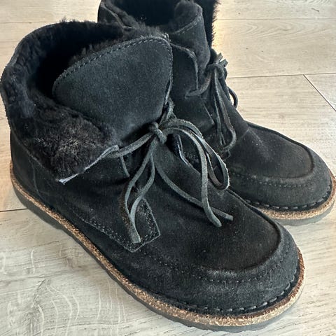 Brune vintersko til Birkenstock . Str 38 normal bredde. Den ene glidelåsen er litt stri og høyre sko over vristen trenger å fikses. Derfor lite brukt. Håper noen kan fikse dem og bruke dem videre. Lite brukt. God til en bred fot. Saueskinn inni.