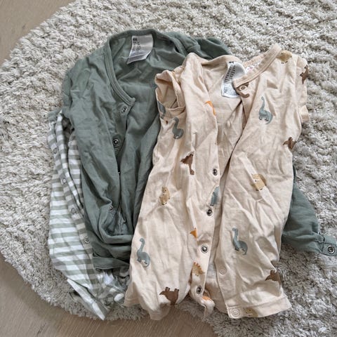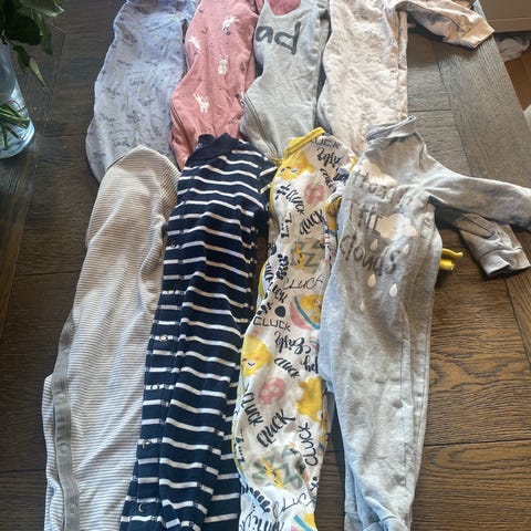 H&M baby pysjamaser, størrelse 62, unisex. Flere ulike farger og mønstre, blant annet stripete og med trykk. Plaggene har lange ermer og lange ben, og er laget i myk bomull som passer til bruk som nattøy eller kosedress for baby. Egnet for både jenter og gutter i størrelse 62/68