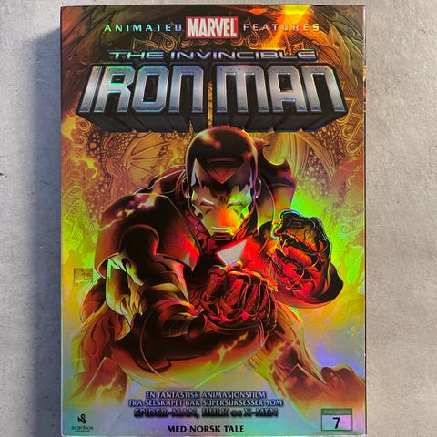 Marvel The Invincible Iron Man DVD med norsk tale. Animasjonsfilm basert på superhelten Iron Man. Leveres i original DVD-cover med illustrert omslag, samt pappcover på utsiden. Filmen er tekstet og dubbet for det norske markedet, og inneholder ekstra materiale som blant annet dokumentar og trailere, avhengig av utgave. Fremstår nesten som ny. Sendes mot porto.