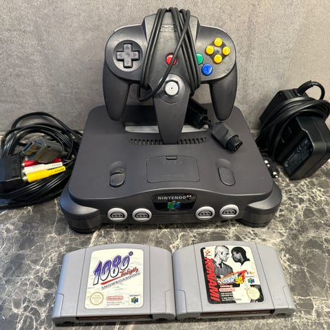 Nintendo 64 konsoll med Jumper PAK pluss 2 stk originale Nintendo AV TV tilkoblinger, Strøm adapter, Thunder PAK , Ultra Racer 64 kontroller, Scart tilkoblinger