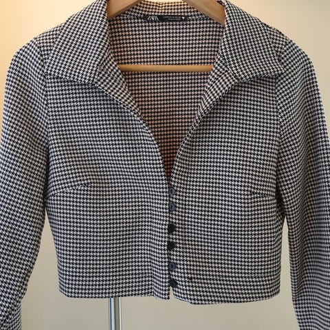 H&M cardigan for dame i størrelse S. Cardiganen er flerfarget med mønster og har krage og knapper i front. Materiale er polyester. Passer som lett ytterlag eller til bruk inne over topp eller kjole.🥰