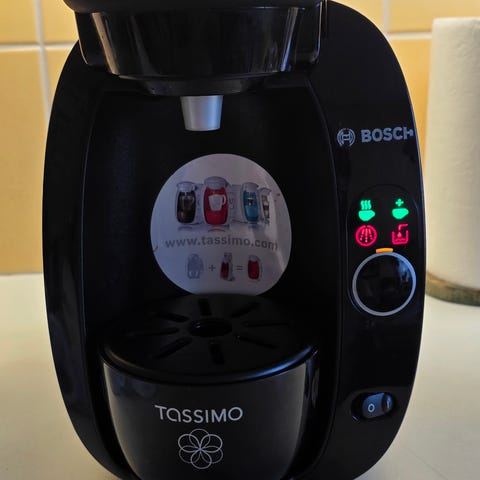 Bosch kapsel kaffemaskin i svart utførelse. Maskinen er laget for bruk med kaffekapsler og har kompakt design som passer på kjøkkenbenk eller i mindre kjøkken. Fronten har betjeningsknapp og plass for kopp under tuten. Egnet til tilberedning av kaffe og varme drikker i husholdning.
