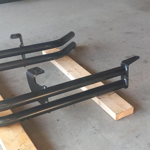 Har aldri vært montert, og fremstår som nye. Men frontfanger har vært utsatt for fukt under lagring, og noe overflate rust finnes på innsiden. Har tatt bilder av dette, og det er ikke mer enn det som er på bildene. Ikke synlig forfra/ utenfra, men bør selvfølgelig slipes og males over. Inkluderer plastdeksler for montering.