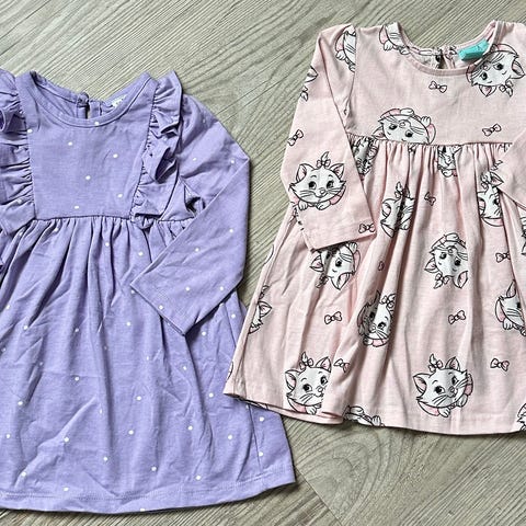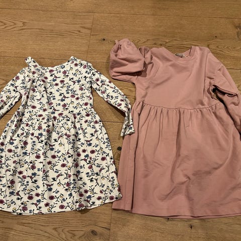 To pent brukte kjoler fra Name it og Gullkorn. Str 110 og 110/116, men er brukt samtidig her. Ser ved fotografering at Gullkorn-kjolen har en begynnnde løs tråd og en liten flekk som ikke er forsøkt fjernet (se bilder).