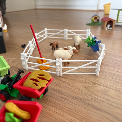 Playmobil samling satt sammen av mange sett med flere ulike figurer og tilbehør. Samlingen inneholder blant annet fantasifigurer, familiefigurer, kjøretøy og små deler som våpen, flagg, barnevogn, gyngehest og annet tilbehør. Delene kan kombineres på ulike måter for rollelek og temalek. Alle deleneer i god stand, med unntak fra sjørøverens skattekiste som har knekte hengsler på lokket.