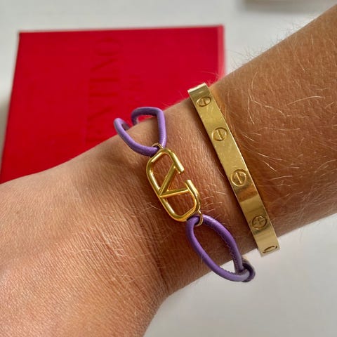 Mockberg armbånd for dame by Martine Lunde. Armbåndet er i metall med gullfarget overflate og har innfelte felt i en lys, kontrastfarge. Det har hengslet åpne-/lukkemekanisme og er formet som en stiv bangle. Innsiden er gravert med «By Martine Lunde» samt Mockberg-logo. Egner seg som hverdags- eller tilbehør til penere antrekk.