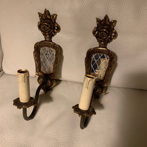 To dekorative vegglamper i aluminium med originale tekstilskjermer. Gir et varmt og koselig lys — perfekt til gang, soverom, stue eller hytte.