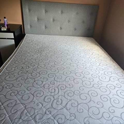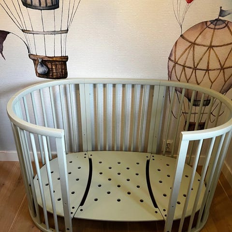 Det følger med to brukte madrasser og madrassutvider. Den ene er avbildet. Har også uroholder i trehvit farge.
